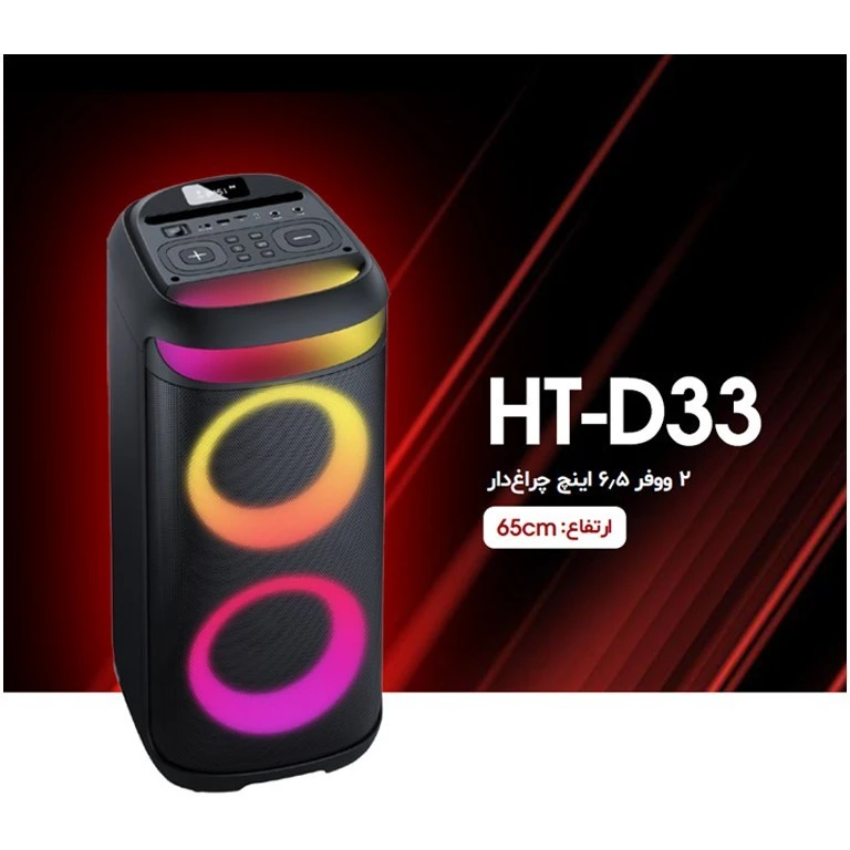 اسپیکر ایستاده شارژی رکسون مدل Rexon HT-D33، با امکانات گوناگون نظیر بلوتوث ، پورت USB، رادیو FM، ورودی میکروفن،